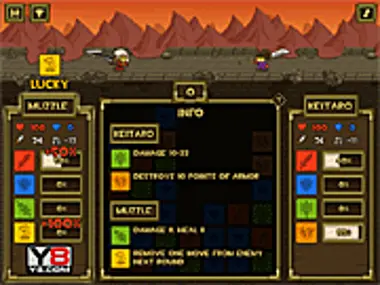 Supera in astuzia e sconfiggi i tuoi nemici nel combattimento più pericoloso e mortale. Scegli tra sette eroi, ciascuno con abilità speciali uniche. Raccogli le gemme corrispondenti per migliorare la tua fortuna nell'eseguire i tuoi attacchi speciali. Solo i più forti e i più fortunati sopravvivranno a questo torneo fatale!